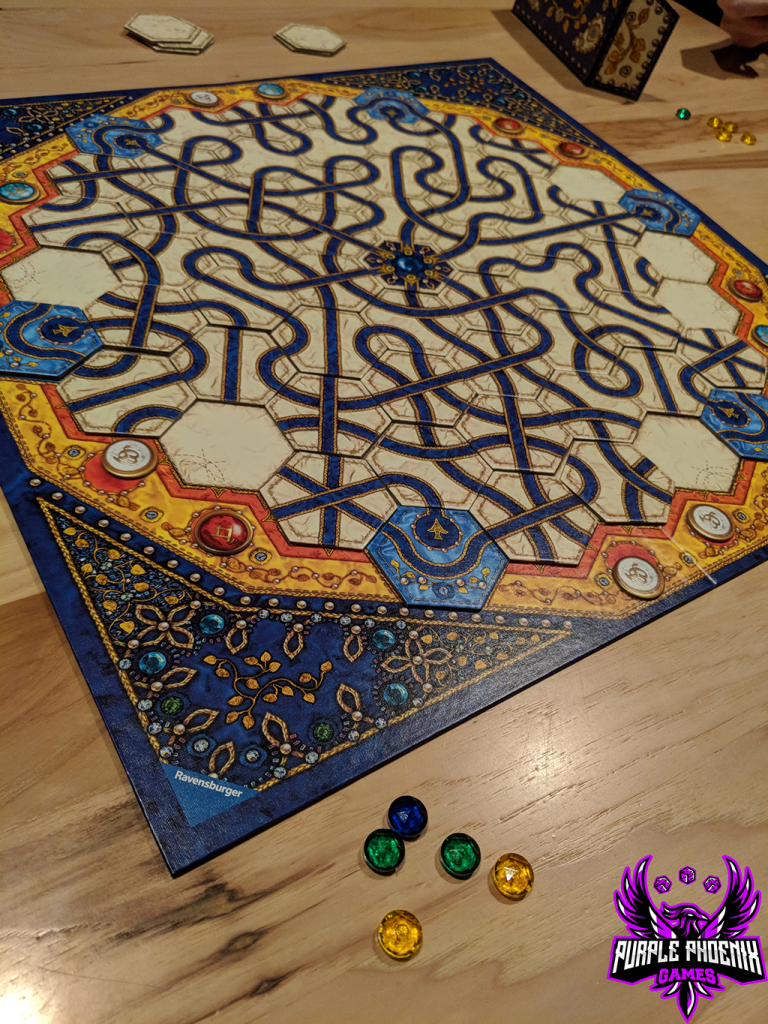 Indigo is a strategy game of tile placement and route building in which players are attempting to get various gems from the center of the board through their “gateways” on the edges of the board to score points. Players are each building their own pathways, in a maze-like sort of way, to maneuver the gems around the board, through their own gateways, and away from those of their opponents. Each player receives one tile, and on their turn, plays it to the board. Tiles can be placed anywhere on the board, they don’t necessarily need to be placed adjacent to other tiles. If you play a tile to extend an existing route with a gem on it, move the gem as far along that route as possible. After playing a tile, you draw a new tile to be played on your next turn. The game continues until all gems have been claimed, and then points are added! Gems are worth points depending on their color, and the player with the highest score wins!