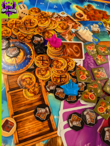Play continues in this fashion until one player crosses the finish line at Port Royal. The round finishes and then players tally points. Points are earned for board space number where their shipeeple finished, doubloons in holds, and positive VP treasure cards. If any cursed treasures are held they are negative VP cards and will be deducted from the player’s total score. The player with the most VP at the end of the game is the winner of the race and thus has bragging rights until the next annual race is held.