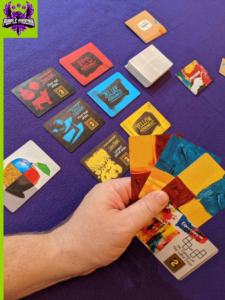 Victory Points are earned by scoring the special requirements of Inspiration, Professor, and Assignment cards once the entire 4 x 4 grid of Canvas cards is complete. Oftentimes players will need to compare scores to determine which player earns the points. For example, the Moret Professor card states that five VP are earned when the player controls the “most color areas with four or more quadrants.” Each Canvas card is divided into four quadrants, and quadrants are colored with one of the primary colors. A “color area” is simply a connected network of the same color within the player’s Scoring Zone. So, to satisfy Professor Moret, the player who controls the most amount of color areas that are four quadrants or larger.