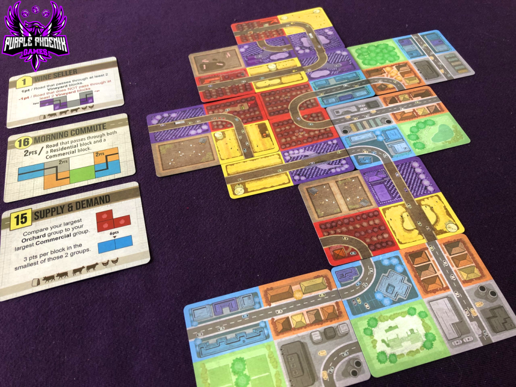 Each card is divided into four zones: cornfields, livestock pens, orchards, and vineyards. The selected scoring condition cards determine how you can earn and lose points for your card/zone placements in the countryside. That’s where strategy comes into play - you can’t just place your cards wherever you want! There has to be a method to the madness, and each placement must be carefully selected for maximum end-game points. When all cards have been played, tally up your points - earning points for each zone, gaining/losing points for scoring conditions, and deducting points for roads. If your final score is higher than the total of the 3 scoring conditions combined, then you have won!