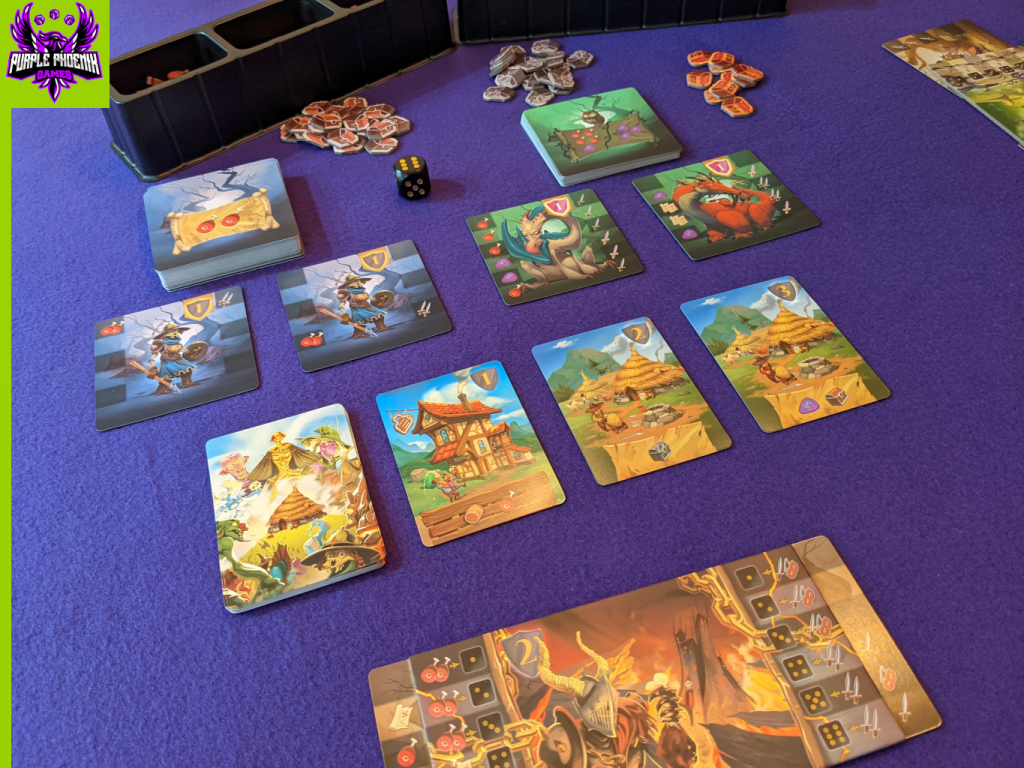 To setup, each player chooses a castle board and is randomly dealt two goblin cards to be added to the castle. These goblin cards have icons on the left and the right of the main character art, and will slide beneath the main castle board on either side to activate their icons for the duration. Next, the human kingdom (that will inevitably be attacked by players) is setup per number of players and placed on the table. The two different creature decks are shuffled and two cards from each pile are revealed. The other tokens are placed in the insert “token reserves” and are available to all. The first player takes the die and is known as the Captain. The game is now setup and ready to begin!