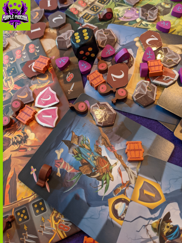 Components. This game boasts some excellent artwork and some of the cutest little tokens I’ve seen. Firstly, the art is simply amazing. I love the looks of it, and the game is beautiful on the table once setup and playing. There are three types of wooden tokens that just make me smile while playing with them: little chicken legs, beer barrels, and cool little purple glyphs. I honestly wish they were bigger, but I understand cost of manufacturing places limitations when trying to keep products within a certain price point. All said, though, the components are great with this one!