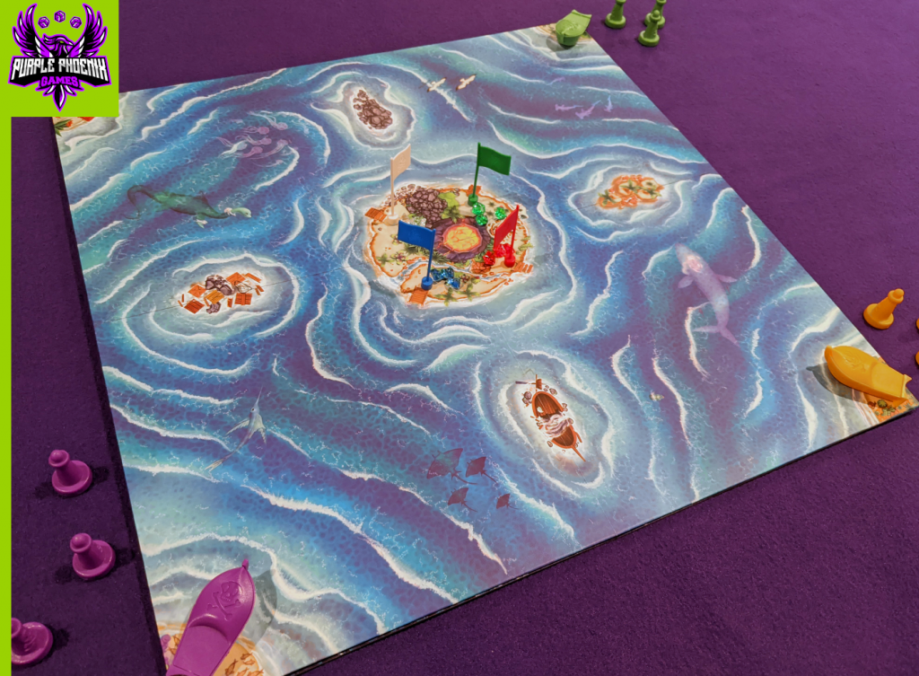 To setup, first place the bracket piece (can only be seen partially in the final photo) in the middle of the table. Next orient the first layer of four square tiles (unseen in photos) on the bracket and then place the game board atop the tiles. Place flags upon the bracket nubs and matching gems at their bases. Each player chooses a color, takes the boat and buoys of that color and places them near the land with the matching dock color. The game may now begin!