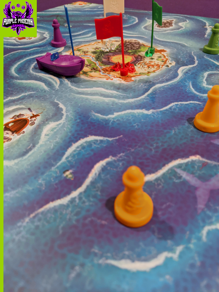 On a player’s turn they must begin their journey from their home dock toward the center island to collect gems. They move their boat using one finger at the stern of the boat and pushing it across the board. Players will know when the boat has hit a hidden whirlpool when the magnets within the boat and within the board meet and create sudden resistance. The player may then place a buoy on that spot to remind themselves, and opponents, where a potential whirlpool spot is located. Should the player make a whirlpool-free trek to the central island, they must dock and collect a gem. From here the player must decide to either return back to their home dock to bank the gem or continue to collect gems before returning home.