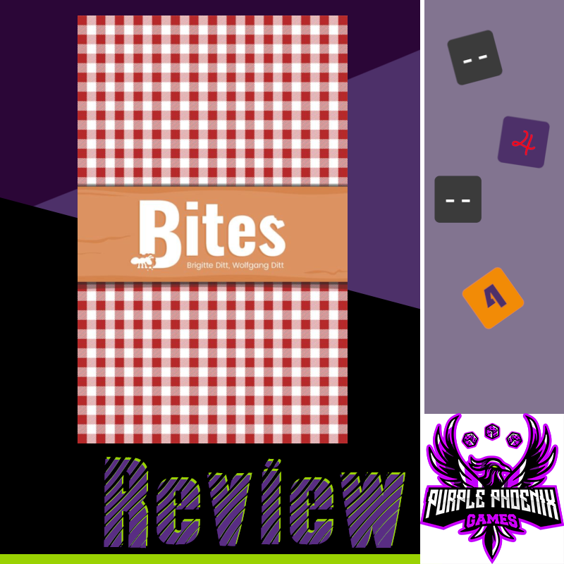 So how do I feel about Bites overall? It’s a quirky, fun little game that is entertaining and engaging. I think it’s a perfect introductory game or a great filler between some heavier games. It plays quickly and easily, and there is just enough strategy to keep players on their toes. Is it one that I will pull out at every game night? Not necessarily. But it is definitely high on my list of games to pull out whenever there are newer gamers at the table! Purple Phoenix Games gives Bites a hungry 8 / 12.