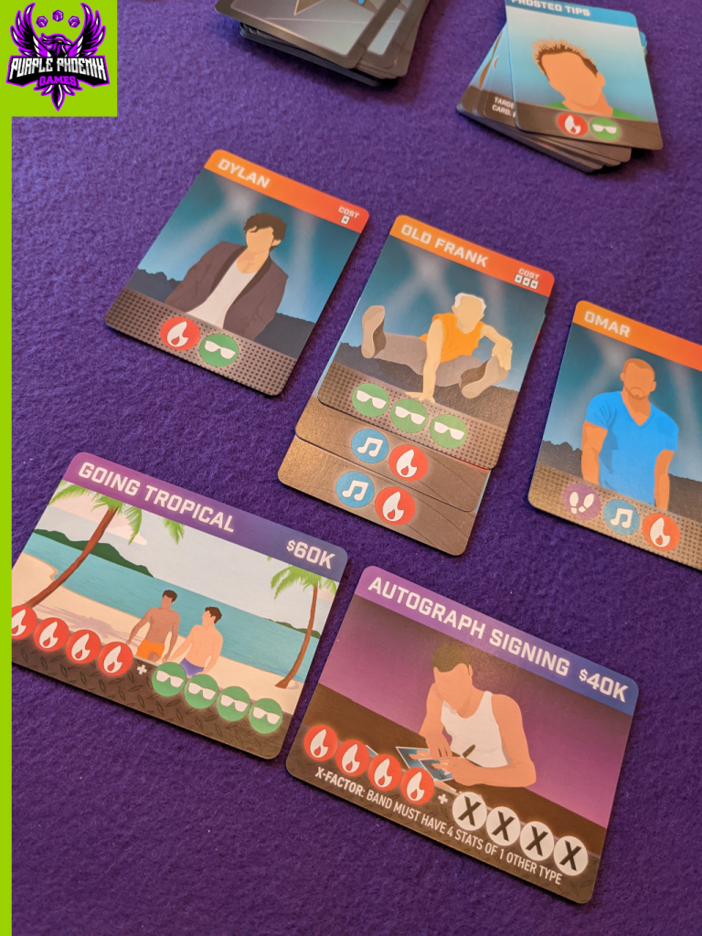 Boy Band Builder (BBB from here out) is a card drafting and band-building game for two to four players. In it, players are band managers tasked with creating the next big group of talented and attractive boys, with the winner of the game being they who earn the most money from assembling the best band and playing the most lucrative gigs.
