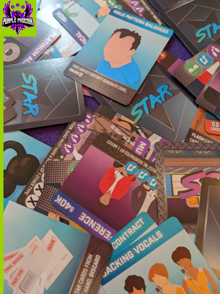 To setup, separate the cards by type and shuffle each stack independently. The Gigs deck is placed on the table with four Gigs displayed from the top of the deck. The Artists and Star decks are placed on the table and each player is dealt three Star cards to start the game. It is now setup and managers are ready to build bands… of boys!