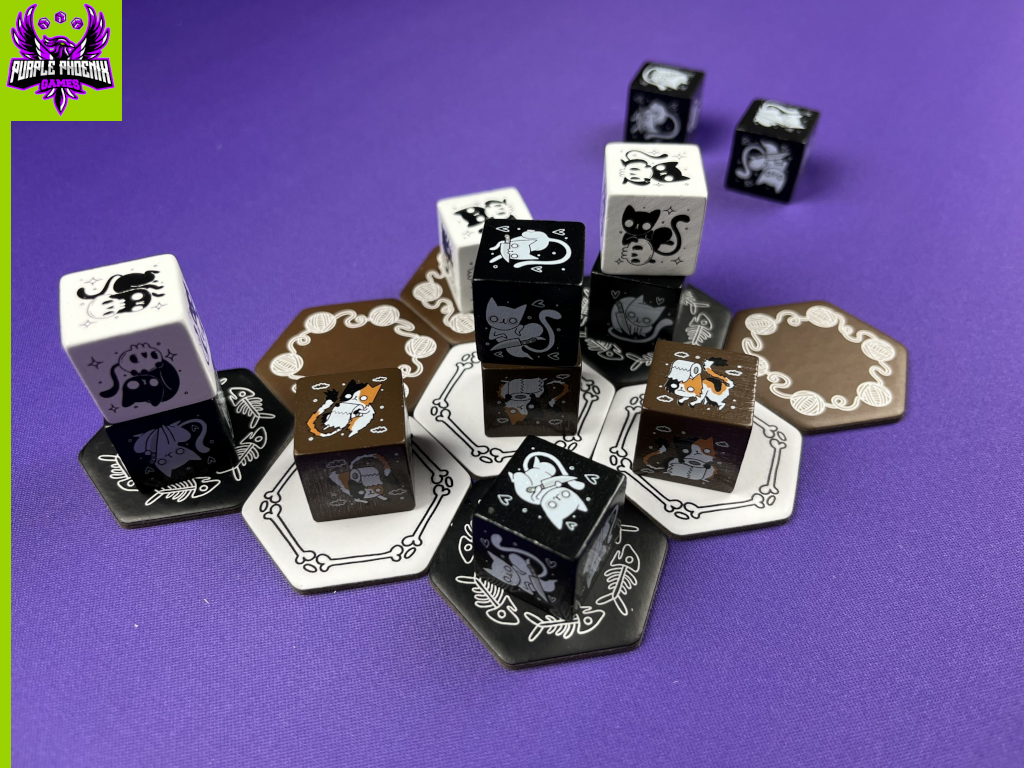 In Cat-a-comb, players are attempting to stack their cat cubes in specific configurations in order to win the game. To setup for the game, shuffle the 9 Region tiles and place them randomly in the starting shape (shown in the rulebook). Each player receives 6 cat cubes in their chosen color, either black or white. One player will then place the 3 Neutral cats (brown cubes) into the play area, each on Region tiles of different colors. The other player will be the starting player, and the game is ready to begin! Pictured below is the setup for the game.
