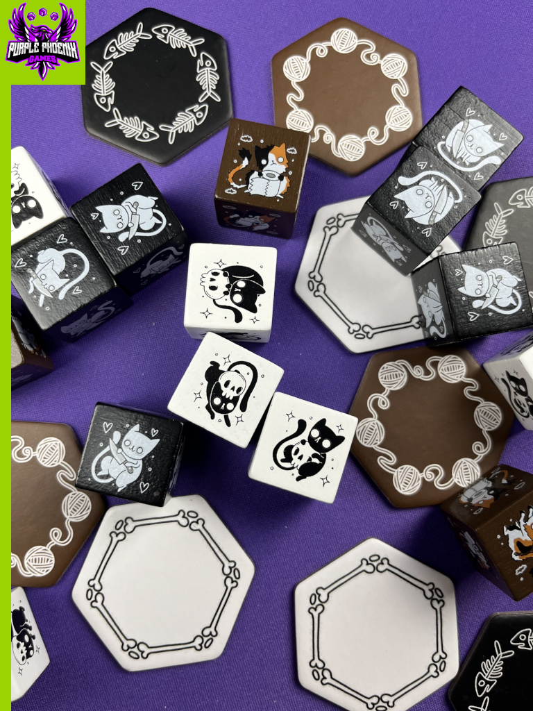 One thing that I really like about Cat-a-comb is that it is so easy to teach and it’s really fast to play. You could probably teach it in under 30 seconds! I know the game says a 15-minute playtime, but all of my plays have been under 5 minutes. So this one works really well when you’ve only got a tiny bit of time, but you still want to play something. Another neat thing is that it has such a small footprint. That helps not only with physical table presence, but it also elevates the strategy of the game too. With only so many spaces to play, and not being able to have 2 Cats of the same color ever directly touching, you really have to be deliberate with your placements and movements. Your strategy needs to be kind of adaptable, but you can’t really just fly by the seat of your pants if you want to have a chance at success.