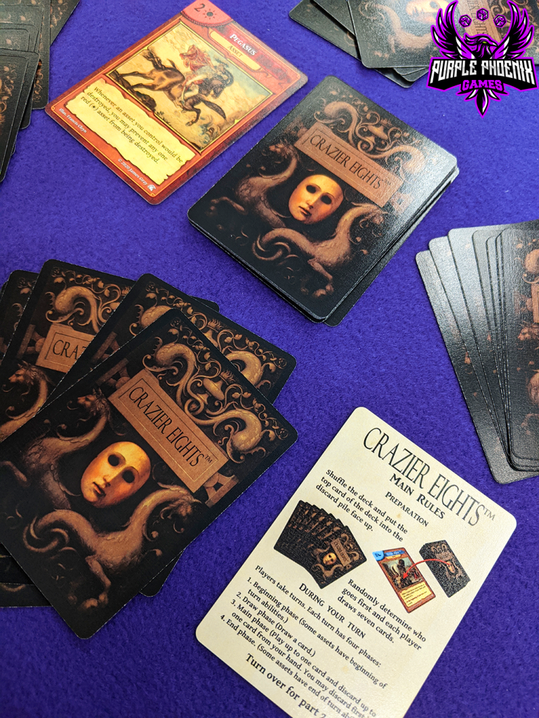 You HAVE played Crazy Eights right? The card game where you attempt to be the first to exhaust your hand of cards, but you can only play down if you can match the suit or number on top of the discard pile? And if you can’t, you throw down an 8 as a wild and call the color to be played next? Well there you have the easy rules. Crazier Eights: Olympus (which I will from here call C8O) holds basically the same rule-set with a few new mechanics and a theme. The win condition is still the same: be the first to exhaust your hand of cards, but to win you will need to play your hand strategically against your opponents.