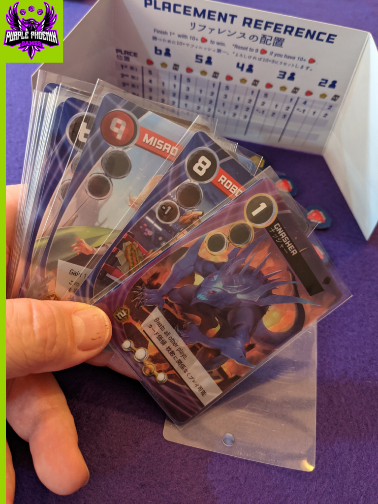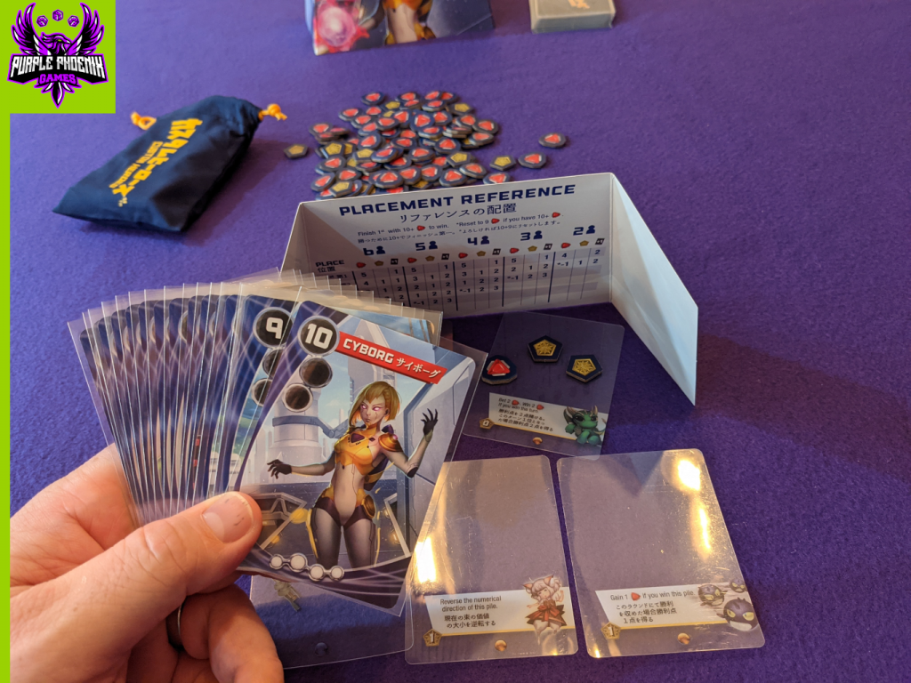Before the first game after unboxing, all Character Cards will need to be sleeved. These Character Cards are numbered from 1-10 and come in six sets (one set of 10 cards for each player, at max player count). To setup the game, each player chooses a Player Screen to hide their resources and provide the scoring table. Shuffle the Character cards and deal each player a hand of 10 cards. For this review, I will be using the two-player rules. Players also begin with 1VP Token and 2 Power Tokens, along with an Ascended Form Advancement Card and Kodora Advancement Card. In a two-player game, players begin with three total Advancement Cards, as shown in the photo below. The rest of the VP Tokens and Power Tokens are placed (or thrown, in my case) on the table, and the remainder of the Advancement Cards are shuffled and placed in the bag to be drawn randomly throughout the game. The battle for tricks may now begin!