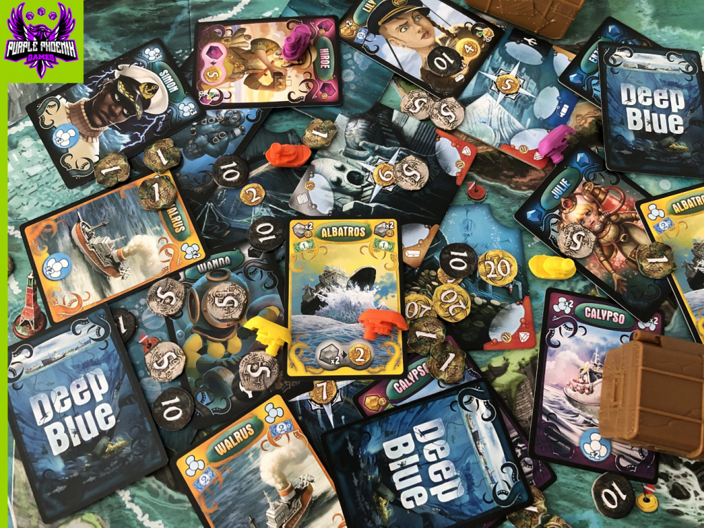Deep Blue is a nautical game for 2-5 players of deck building, hand management, and a bit of push your luck. In it, players take on the roles ship Captains who are racing to collect treasures from undersea wrecks. Players will be hiring Crew members, sailing across the sea, and sending divers down to wrecks to salvage any valuables. The race is on, though, because you are not the only Captain on this treasure hunt… Throughout the game, players will stumble across 4 Wrecks that make up a Sunken City. Once all 4 areas of the Sunken City have been discovered and searched, the game ends. The player who earns the most VP from their collected treasures by the end of the game is declared the winner!