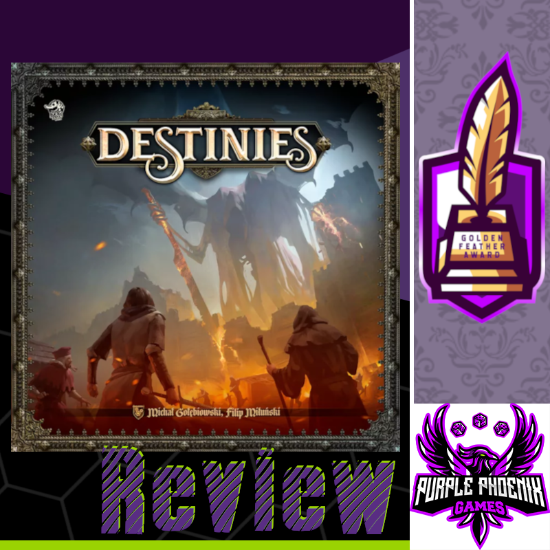 If you are anything like me and have now embraced the hybrid gaming trend, I highly recommend Destinies. I plan to also review all the expansions in the near future, so do look out for those, but please do yourself a giant favor and pick up Destinies. The excellent storytelling, great components, and just amazing fun helps Purple Phoenix Games give this one a perfectly deserved 12 / 12, and a Golden Feather Award! I can’t stop thinking about it and how I would play it differently next time, and hopefully after I have played through the expansion material I will be able to restart from the very beginning with different characters and choices. It’s a sign of a great game when I can’t stop thinking about it, and I do believe Destinies currently is knocking at the door of my Top 10 Games of All Time. No, it’s there. It’s totally there. TOP 10 BABY!!