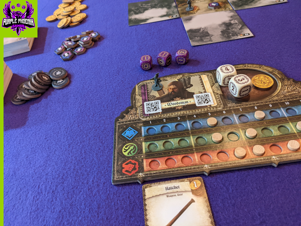 Usually I list out the steps to setup a game in this section, but there are so many little items and steps to be taken that I will simply show you, the reader, how a scenario may look once setup. The app will instruct players how to create their character’s stats and which map tiles should be placed out initially. Typically, though, each player will receive a player board, Destiny card (with their character headshot on one side and their Destiny choices on back), two main dice, three effort dice, and one gold coin. Once setup, the app will drive the story along and the players will be rolling dice and making choices in order to win the game or scenario.