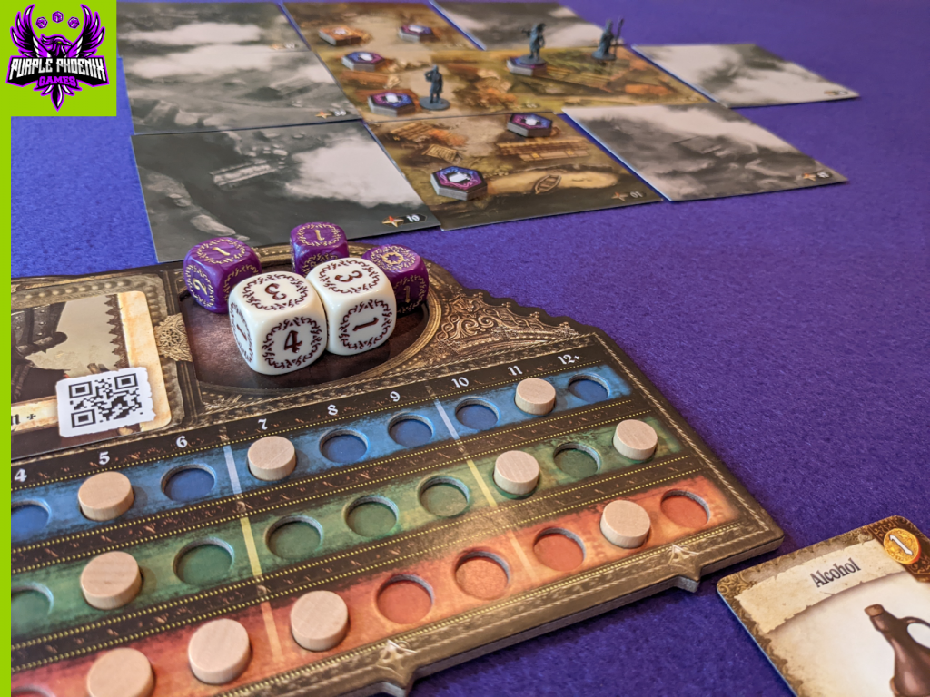 The most interesting aspect of this game is the experience tracker and results of tests. Player stats are divided between Intelligence, Dexterity, and Power (Strength for my D&D readers). These stats are constantly in flux due to tests and experience, and levels range from 1-12+ on the player board. A player will roll both main dice and any effort dice they wish on each test, and the total result is compared to the discs present on the main player board. One success is counted for each disc’s value equal to or below the rolled result. For example, if the roll is a 6, and the player has a disc on 3 and another on 6 the player counts two successes. Effort dice add values to the rolled result, and one side of these dice depict a star, which counts as one success. Throughout the game players will be moving their skill marker tokens (discs) up and down the tracks. Sometimes this is due to a test being failed or succeeded, but sometimes experience tokens are earned. A player may improve their skill levels by two total values on the tracks for each experience token discarded. Players may choose which tracks, and may maximize their character’s skill or spread out the experience across multiple skills.