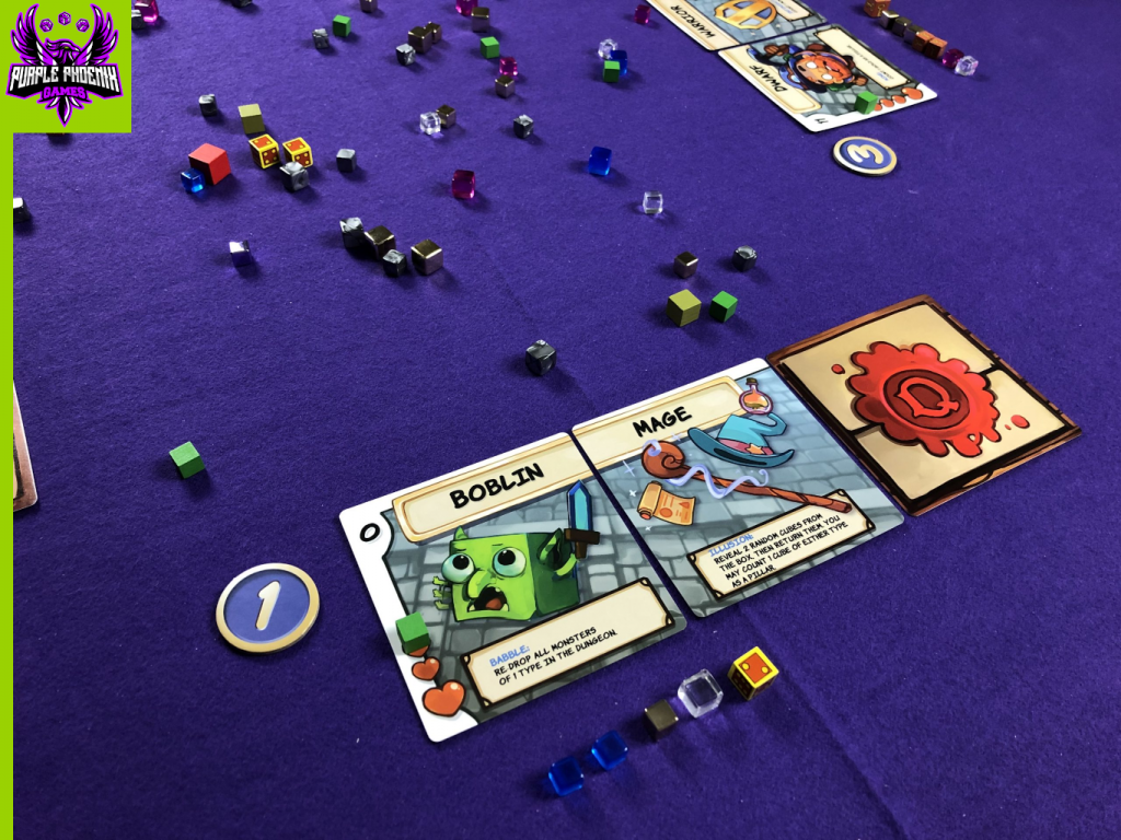 Another problem I have had in my plays of Dungeon Drop is that the layout of the dungeon is usually very limiting. For some reason, all my Pillar cubes will end up clumped together and severely affects what you can do on your turn. Yes, more cubes are being added by each player every turn, but the Pillars are what you use to create rooms - if they’re all too close together, you get small rooms, or basically all Treasure lays outside of any possible room configurations. The solution that I’ve come up with for this issue is to drop all Treasure and Monster cubes as described in the rules, but then ‘sprinkle’ the Pillar cubes across the play area. It just helps even things out and create a bigger playing field.