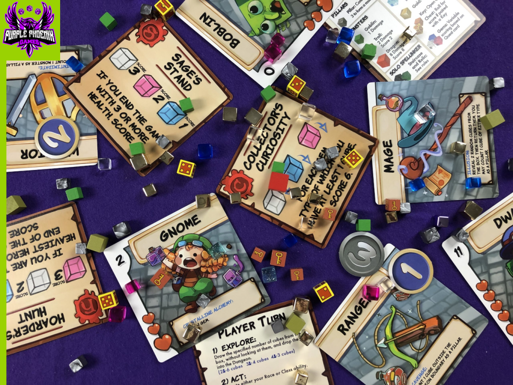 The game is played over 3 rounds during which each player will take a turn. Turns are broken down into 3 steps: Explore, Act, and Loot. To Explore, the active player will take a set number of the Larger cubes from the game box (at random, without looking), and will add them to the dungeon by dropping them onto the table. The next step is to Act. Each Race and Class card has a special ability, and during this step you will choose to activate one of those abilities to use this turn. The final step is Loot, and this is where the crux of the gameplay is. The cubes of the dungeon consist of Treasure cubes, Monster cubes, and Pillar cubes. Pillar cubes are what form the ‘rooms’ of the dungeon. When it is your time to Loot, you will form a room by selecting 3 Pillar cubes. These cubes will essentially form a triangle, and the inside area of that triangle represents the room in which you are in. Once you form a room, you will collect all cubes from within that space - whether they be Treasure or Monster cubes. Treasure cubes go into your Stash and are saved for end-game scoring, and Monster cubes will deal Damage to your Hero. All Heroes have a finite amount of Health, and you can never collect a Monster cube that would cause you to lose your last Health point.
