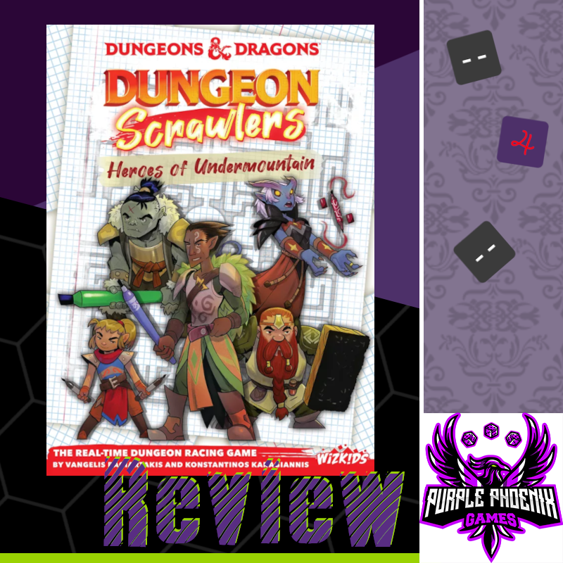 So do I like Dungeon Scrawlers? Yes! It’s a fun, fast-paced game that is easy to teach, learn, and play. It’s pretty light-hearted but still gives you some strategic options with the real-time pressure. It’s not necessarily one that I’ll pull out at every game night, but it’s one that I can definitely use as a quick little filler, introductory game, or a game to use with younger gamers! This game is a neat concept that is executed well, and it makes for a fun time for all players. Purple Phoenix Games gives this one a scrawling 4 / 6. This game sounds easy, but add that real-time race and it gets a whole lot harder!