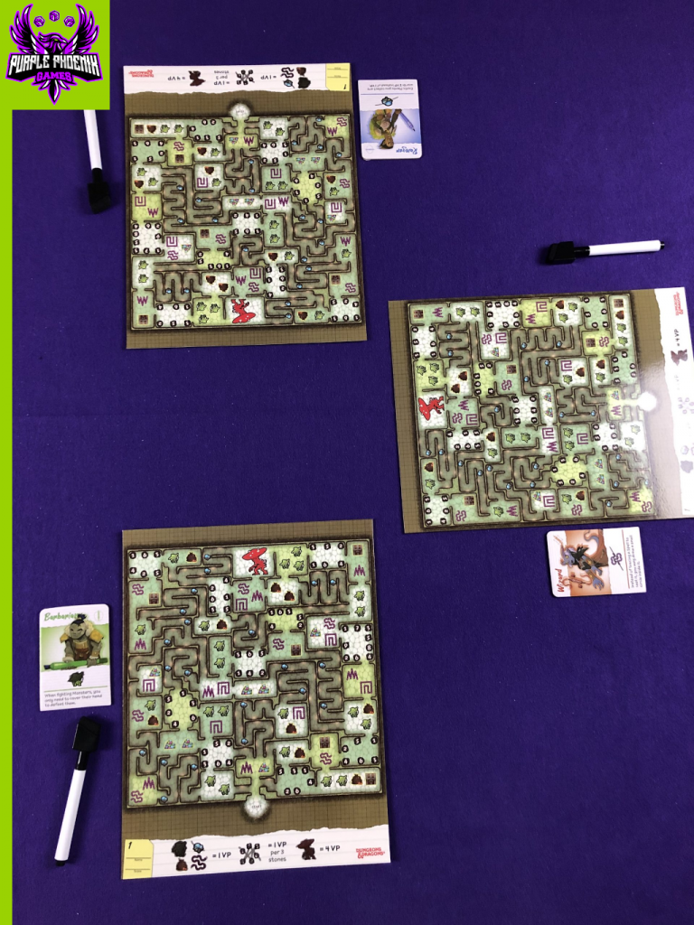 Dungeons & Dragons: Dungeon Scrawlers - Heroes of Undermountain (simply referred to as Dungeon Scrawlers from here on out) is a real-time line drawing maze race for 2-4 players. The goal? To crawl your way through the dungeon floors, defeating Monsters/collecting Treasures/casting Spells/and more to collect the most VP by the end of the game. To setup for a game, each player receives a marker and a random Character. Select the Dungeon you wish to play this game, and give the corresponding sheet to each player. Check the bottom of the Dungeon sheet to see if any special components are needed (more on this in a bit), grab a timer, and the game is ready to go! Pictured below is the setup for a 3-player game.