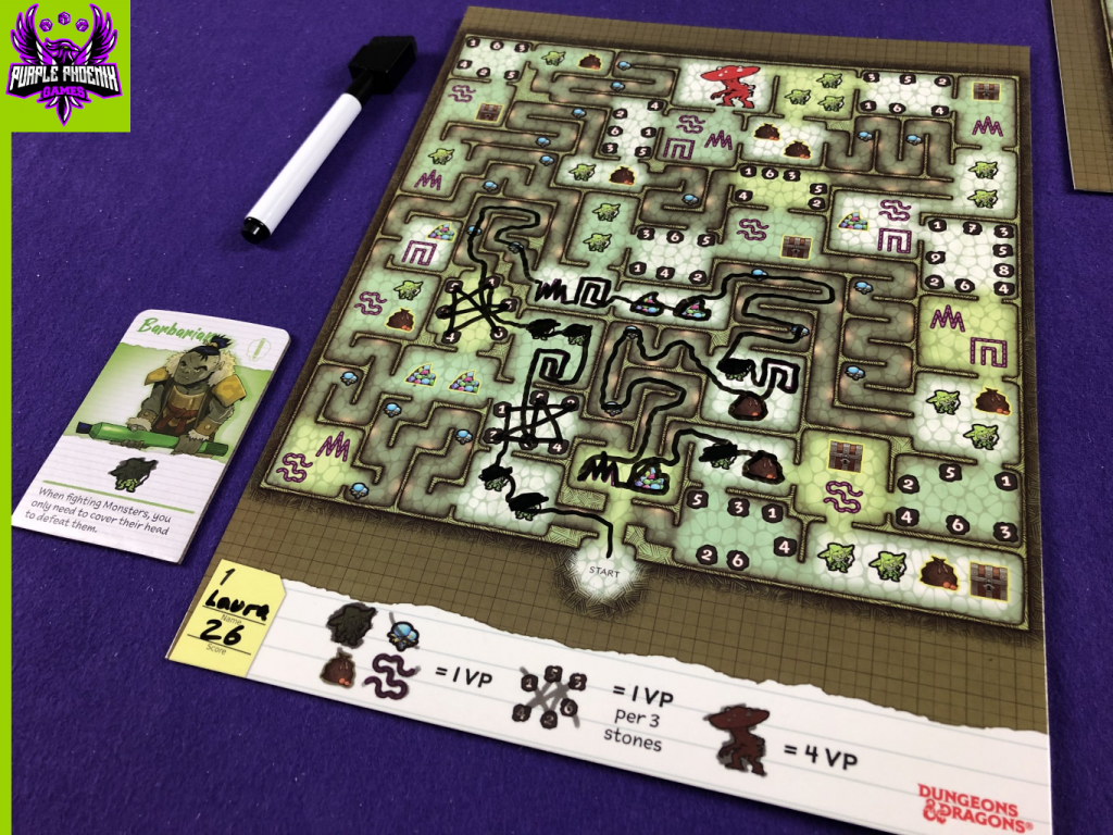 Inside the rooms of the dungeon, you will find Monsters, Treasures, Spells, Artifact Fragments, or Exotic Plants. Each is dealt with in a specific way, and award you VP when scoring the dungeon floor. To defeat a Monster, you must draw over and fully color it in. To case a Spell, you trace the indicated path. To collect a Treasure, you must completely outline the treasure icon on your sheet. Artifact Fragments are collected by connecting the stones in numerical order, and Exotic Plants are collected by simply drawing a line through them. If you leave a room and you have not interacted with every element within, you will earn negative VP for any elements you missed! Each player is given a Character at the game start, and these Characters provide special rules/abilities for use throughout the game. For example, the Barbarian allows you to only color a Monster head to complete it, instead of having to color the entire thing. And that could be a huge time-saver in the long run! So knowing your Character ability, and how to effectively utilize it, is a huge bonus in the game.