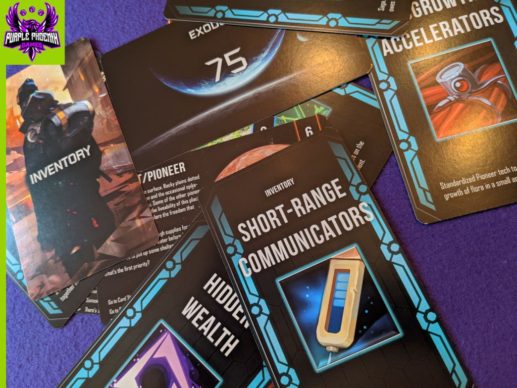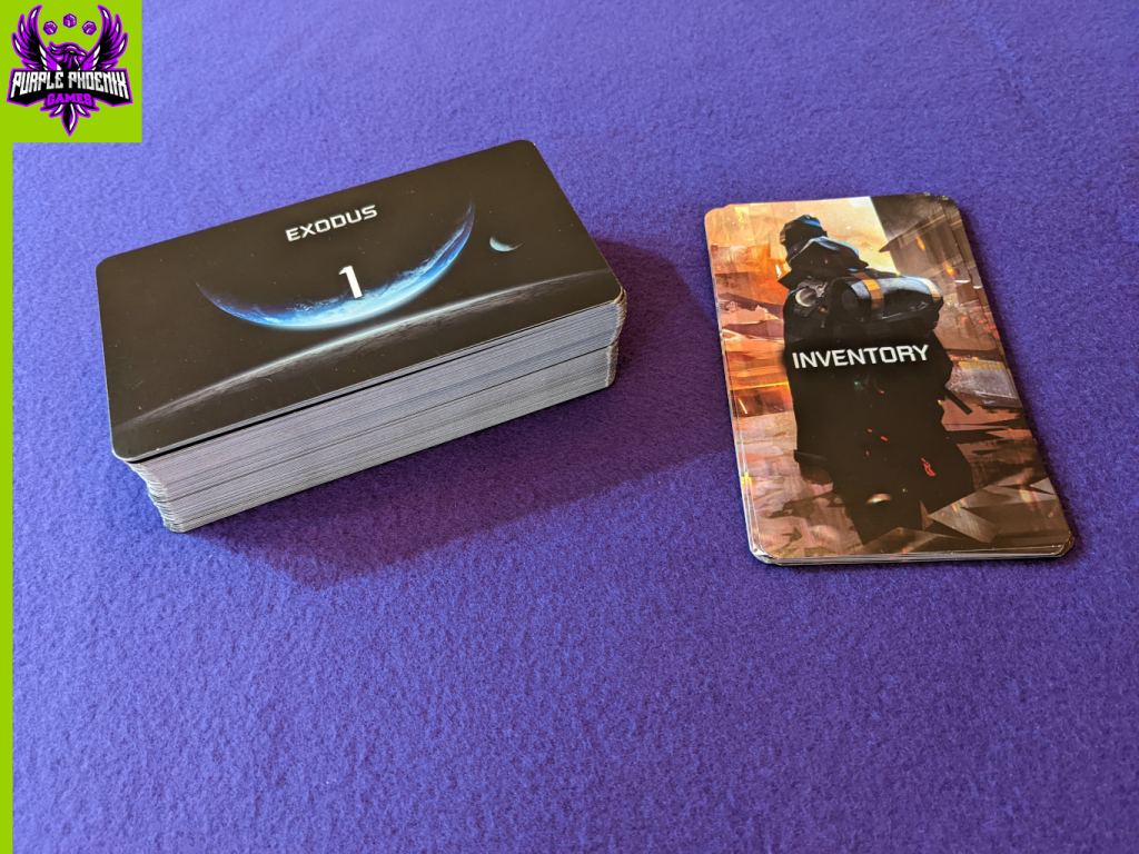 Setup is super simple with this one. Yank out the cards from the box (and make sure they are numerically ordered), place them in a stack on the table, and also place out the stack of Inventory cards. The main Exodus cards are numbered 1-121 and there are 12 Inventory cards. Determine the first reader and the game may begin!
