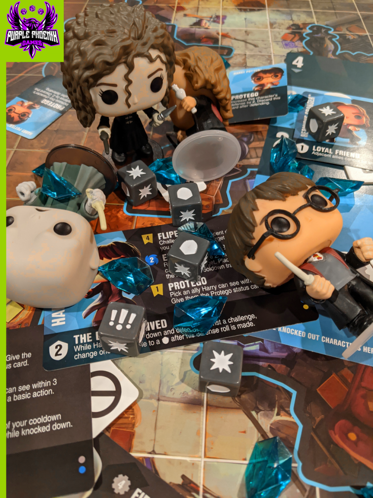 Funkoverse Strategy Game: Harry Potter (which I will now refer to as HP Funko) is a tactics-based strategy game where effectively using Action Points is the determining factor in victory. Each player will take charge of a 2- or 3-character team engaged in one of four included scenarios to gain VP (the awesome teal shards). This is done in different fashions, and for this review we used the “Territories” scenario.