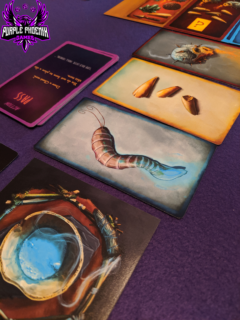 Before the round begins, all players will roll all three of their dice simultaneously. These dice represent your bid amounts for the Item cards on display (including the face-down Item). Whomever is in possession of the first-player marker will take their turn first. This goblin may choose to play any number of Cheat cards in their hand, and then must place a die on an Item card or into the altar. These Item cards feature items to be collected and used to satisfy an Offering card - like skulls, goblin teeth, glow worms, and others. By placing a die on an Item card, a goblin is casting their bid. By placing a die into the sacrificing altar, the goblin is instead giving up a bid die in exchange for drawing a Cheat card (which can be very powerful). Once the die is placed, the next goblin in clockwise order can take their turn following the same order of operations. The goblin who wins the face-down Item card becomes the new first player and receives the first player token. A new round can now begin by laying out new Items and rolling all dice simultaneously.
