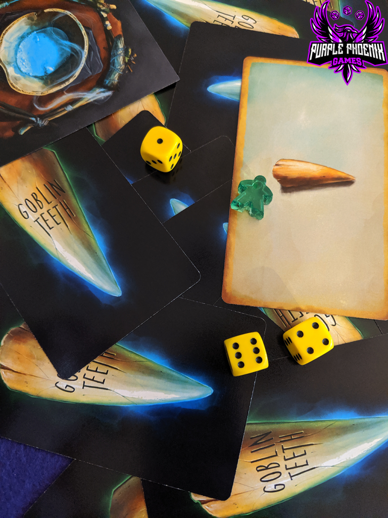 Goblin Teeth is a fantasy take-that, auction, set collection, dice and card game. Each player is a goblin attempting to impress the goblin boss enough to become the right hand gobbie by offering a collection of items that the boss enjoys.