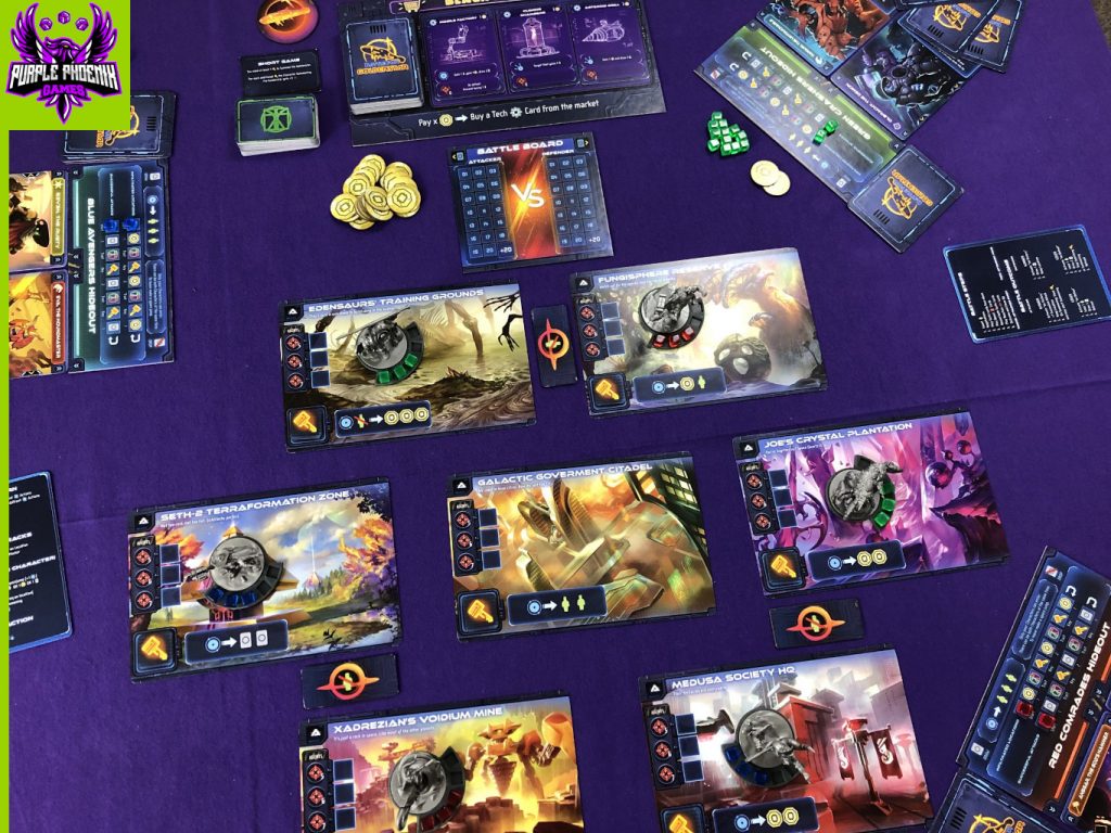 All of the actions described above ‘cost’ one Action to perform, and each of your Challengers only gets 2 per turn. You may perform any number of free actions each turn. These are to play a card with the Free Action symbol, or to buy a card from the Black Market. Cards purchased from the Black Market go directly into your hand, and can be used in battles or to perform Actions. To end your turn, you discard down to 5 cards and 5 credits, and restock the Black Market, if necessary. The game then moves to the next player, and continues in this fashion. Something to note about your Actions - you may not perform the same Action twice with the same Challenger. So I cannot make my Challenger 1 Move twice in the same turn. Something to consider as you strategize! The game plays on, with each player performing Actions with their Challengers, until one player is successfully able to Challenge All. That player is declared the winner of the Goldenstar Tournament!