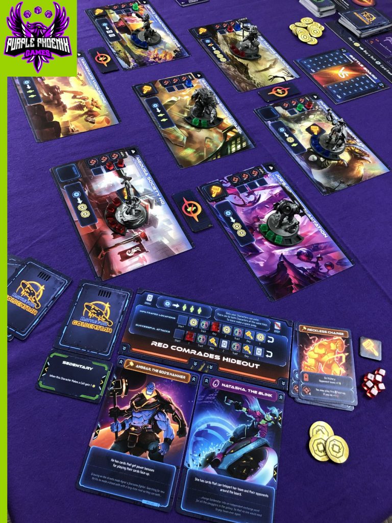 Components. As I mentioned earlier, this is a prototype version of the game, but with that said, I like the direction the game is headed. The artwork is colorful, thematic, and fun to look at. The boards, tokens, and cards are a good quality and easy to manipulate. The text on the cards is clear, and the iconography is uniform and understandable. I’m not really someone who is into minis, but I have to say that these minis are so detailed and awesome that I just sat here for like 10 minutes looking at them when I first got the game. They’re awesome. The rulebook can use some editing/clarification, but I know this is still a work in progress, and have no doubts that any issues are being addressed and edited. Even for a prototype copy, a decent production quality here.