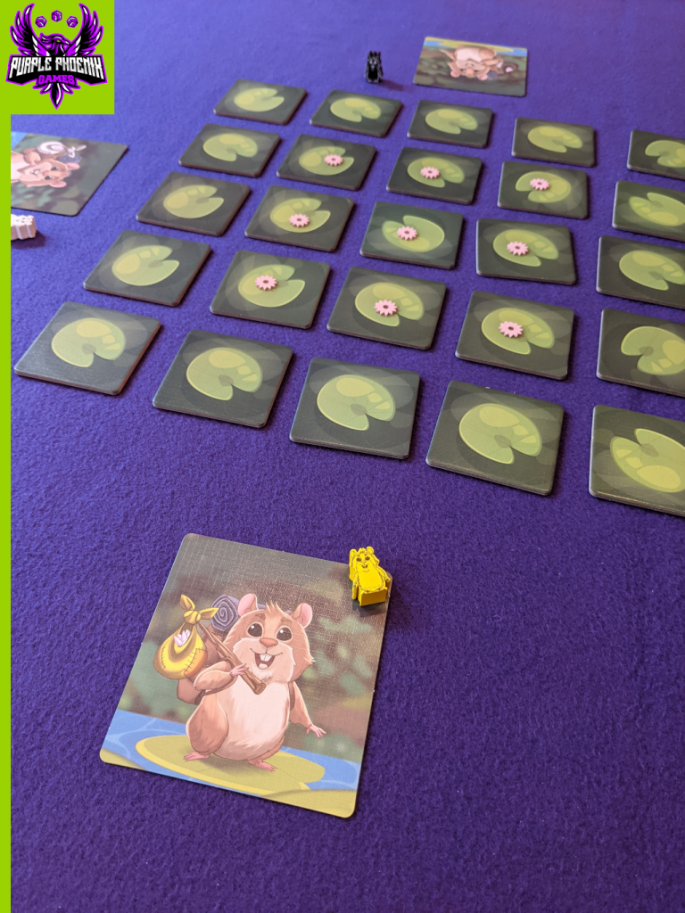 To setup, determine the appropriate grid size for the number of players per the rulebook. Shuffle all the lily pad tiles face-down, place them in the grid, then place upon them nine lotus flower tokens. Each player will select their hamsteeple and mat and the game may now begin!