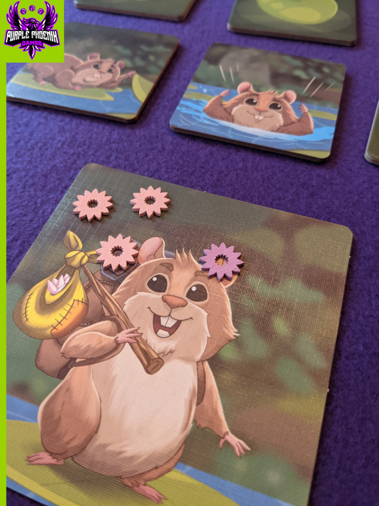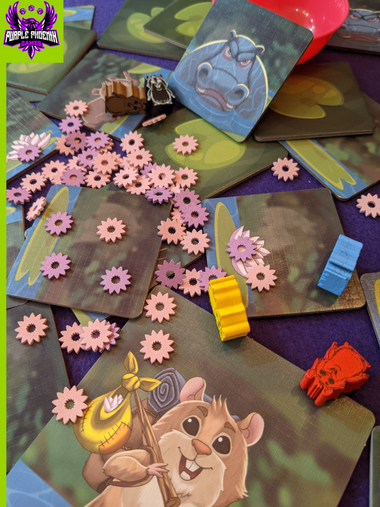 Components. This one is easy. This game is a bunch of lily pad tiles, some cardstock player mats, wooden lotus flower tokens, and cute little hamsteeples. The tiles are good quality, the player mats are big and nice, and the hamsteeples are precious. I enjoy the lighthearted art style quite a bit - even the angry-looking hippo tiles. My only issue lies with the lotus flower tokens. They are very thin painted wooden tokens in two colors - pastel pink (worth 1 VP)and slightly darker pastel purple (worth 3 VP). I am not colorblind, but I like to make mention of items I would think are not colorblind friendly. The difference in color is not great enough, even for me of acceptable color differentiation. Another thing about these is they are very thin and delicate. Normally this isn’t an issue for me, but this is clearly a game my children want to play. When they play this with me I am always holding my breath just waiting for them to break a lotus flower. It hasn’t happened yet, but I might see about adding sturdier components to my copy when I play with little ones.