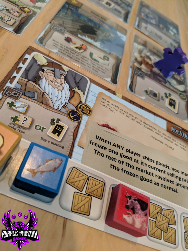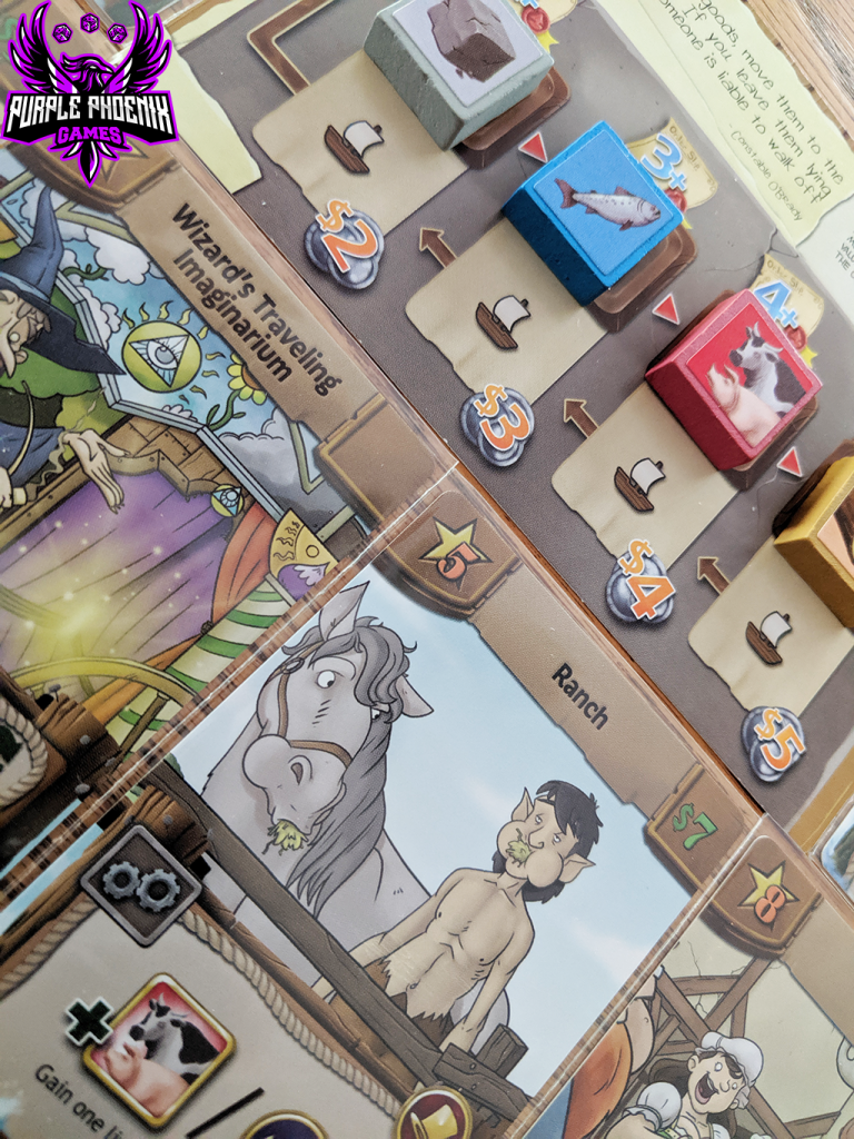 To setup give each player a gobleeple of their color choice (I choose you, purple!), a player board of their choice - or randomly dealt, and one token of each good to later be placed on their warehouse spaces. Place the main market board in the middle of the table with one goods token per space on the market to indicate starting prices for each good. Have each player now assign goods to warehouse spaces not to exceed three total goods stored. Shuffle the main building cards and place out in a grid a number of cards equal to three plus the number of players (seven total in a four-player game). Determine the starting player and you are ready to begin!