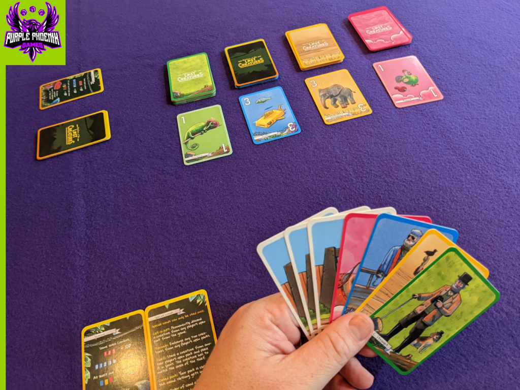 To setup, players choose one hunter card from each of the four hunting zones: Sea, Forest, Plains, and Air, as well as three “Park Closed” cards. The creature cards are to be split by zone and shuffled, with one special card (Turnado and Cat-a-Pult) added. These shuffled decks are then placed on the table and the top card revealed from each deck. Players decide turn order and the game may begin!