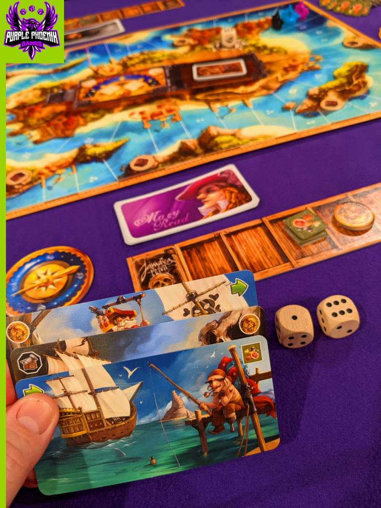 To setup, place the main board in the center of the table. Each player chooses a pirate captain and receives all components of that color. In addition each pirate will receive 3 doubloons, 3 food tokens, and 3 cards drawn to begin their journey. Consult the rulebook to setup the rest of the components, give the starting player the token and dice and the game may begin!