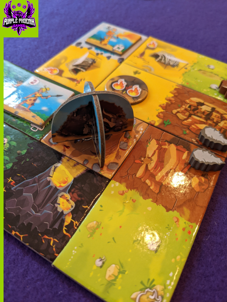 To setup (a two-player game playing the Tribe mode is used for this review), place the Cave Board on the table, shuffle the Caveman tiles, and deal four to the board. Separate the fire tokens and resourceeples into their piles on the table. Shuffle the main domino tiles and, as in the original, draw four, arrange them numerically, and reveal them to make the offer. Place another four domino tiles nearby, face-down, and arranged numerically. The players each choose a color, takes their starting tile with hut placed atop, and their two chiefeeples. The first player will choose to take tiles 1 and 4 or 2 and 3 from the offer by placing their chiefeeples upon them. The game is now setup for Tribe Mode and ready to begin!
