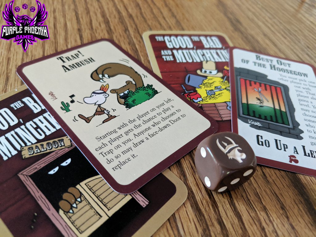 Components. It’s a bunch of cards and one die. The cards are of okay quality. Nothing to write home about. The die is nice with one of the faces having the Munchkin logo head imprinted on it. It will also have a color scheme that matches the version of Munchkin you are playing, so it’s easy to match them back up if they become integrated with each other. Overall, the components are fine, but not wonderful. That’s probably why these are pretty inexpensive to purchase.