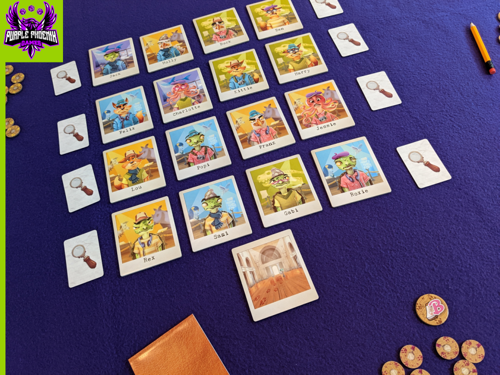 To setup, the Emergency Exit tile is placed on the table while the other 24 Suspect tiles are shuffled and placed into a 4×4 grid; the remaining eight tiles are discarded to the box face-down. Each of these tile feature artwork of an animal and several distinguishing features. On the east and west sides of the grid will be placed one Clue card that exonerates certain features found on the Suspect cards. Each player chooses a color and takes all components of that color along with a notepad and pencil. Once the table is set, the investigation may begin!
