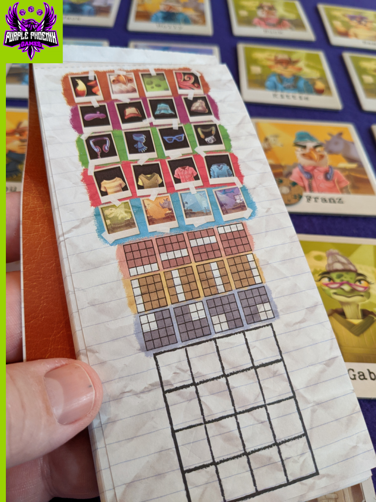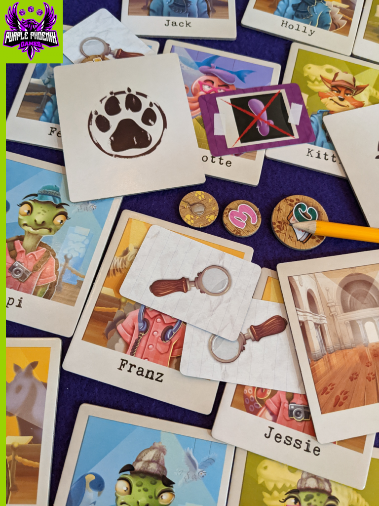 Each turn the active player will complete two phases: Investigate a Clue and Suggest a Suspect. They will place one of their colored Investigation Tokens face-up on a Clue card after viewing its art. The art depicted notates either a feature of the character on the Suspect tiles or a specific area within the 4×4 grid of Suspect tiles. Whichever is pictured on the card notes Suspects that are INNOCENT. For example, the card could show a trucker hat. All Suspects wearing trucker hats are now absolutely innocent and can be marked off the player’s notepad. Perhaps the card highlights all Suspects in the top row of the grid. Similarly, the player then marks off all Suspects in that top row from their notepad. These animals are innocent.