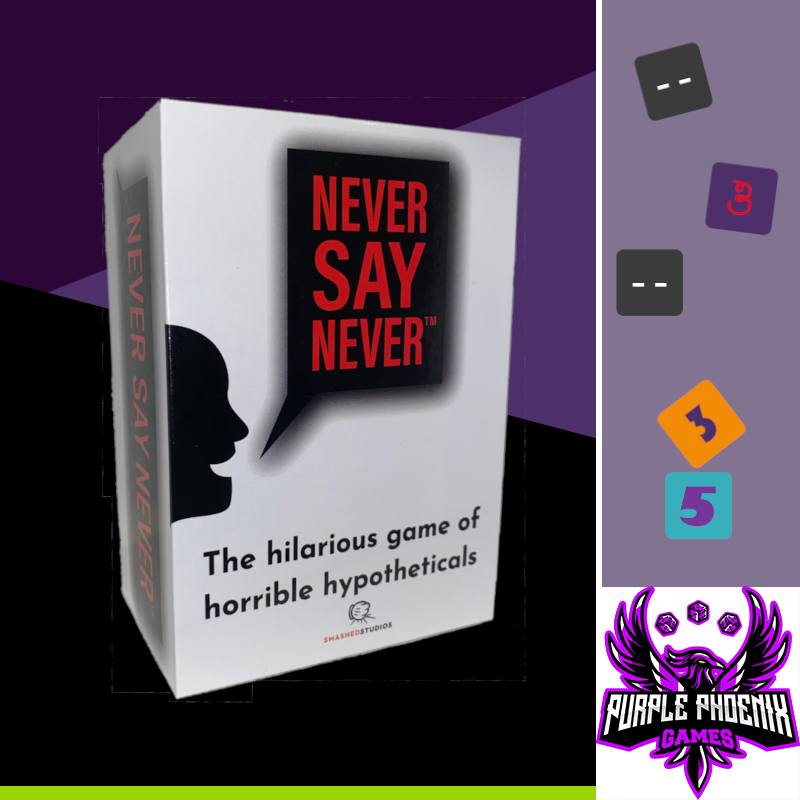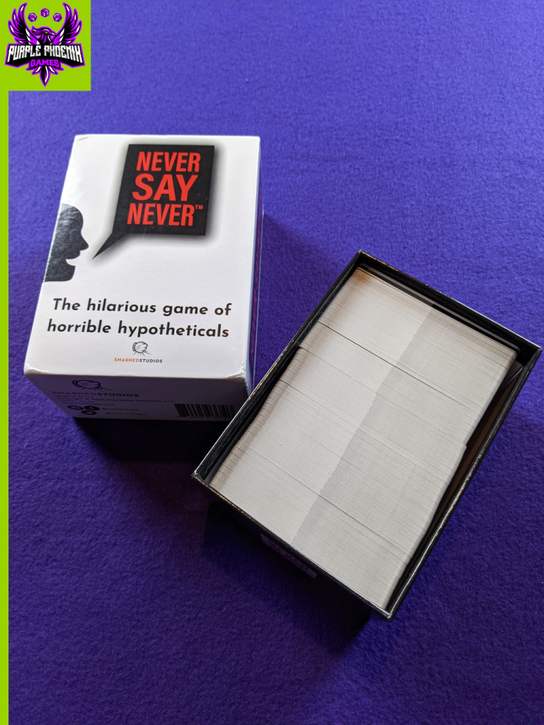Never have I ever played Never Have I Ever. At least I don’t remember ever playing it. You know the one. A player says they haven’t done something and if you have you have to either eat a Twinkie (not a sponsor), take a drink of whatever, or put down a finger. That’s the general idea of that game. Never Say Never definitely takes inspiration from this aforementioned classic (?) and puts a new twist on it. Read on if you are intrigued.