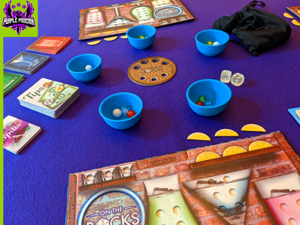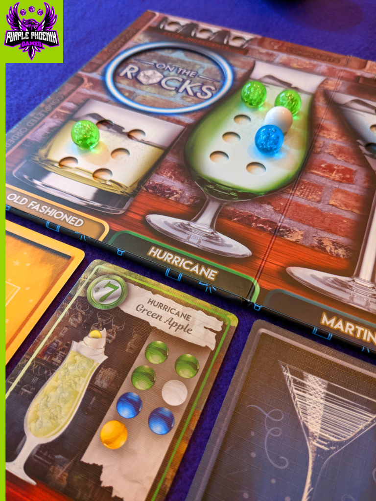 “On the Rocks is a marble drafting, cocktail recipe fulfillment game for 1-4 players. It is NOT a drinking game.” - straight from the game’s BGG page. So what does that mean? Well, this one is a variation of the “I cut, you choose” style game, but HEAVILY themed around bartending and enhanced with additional fun mechanics. The winner is the player who amasses the most amount of money by the end of their shift.