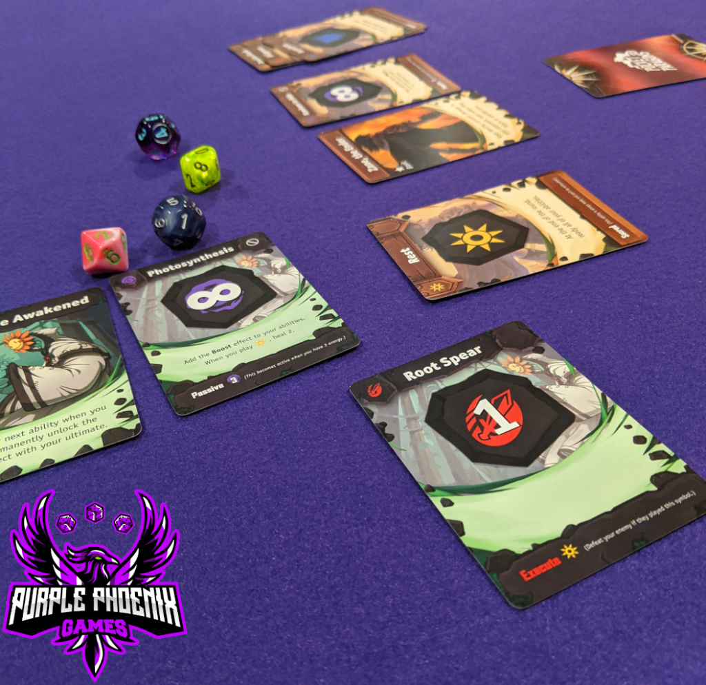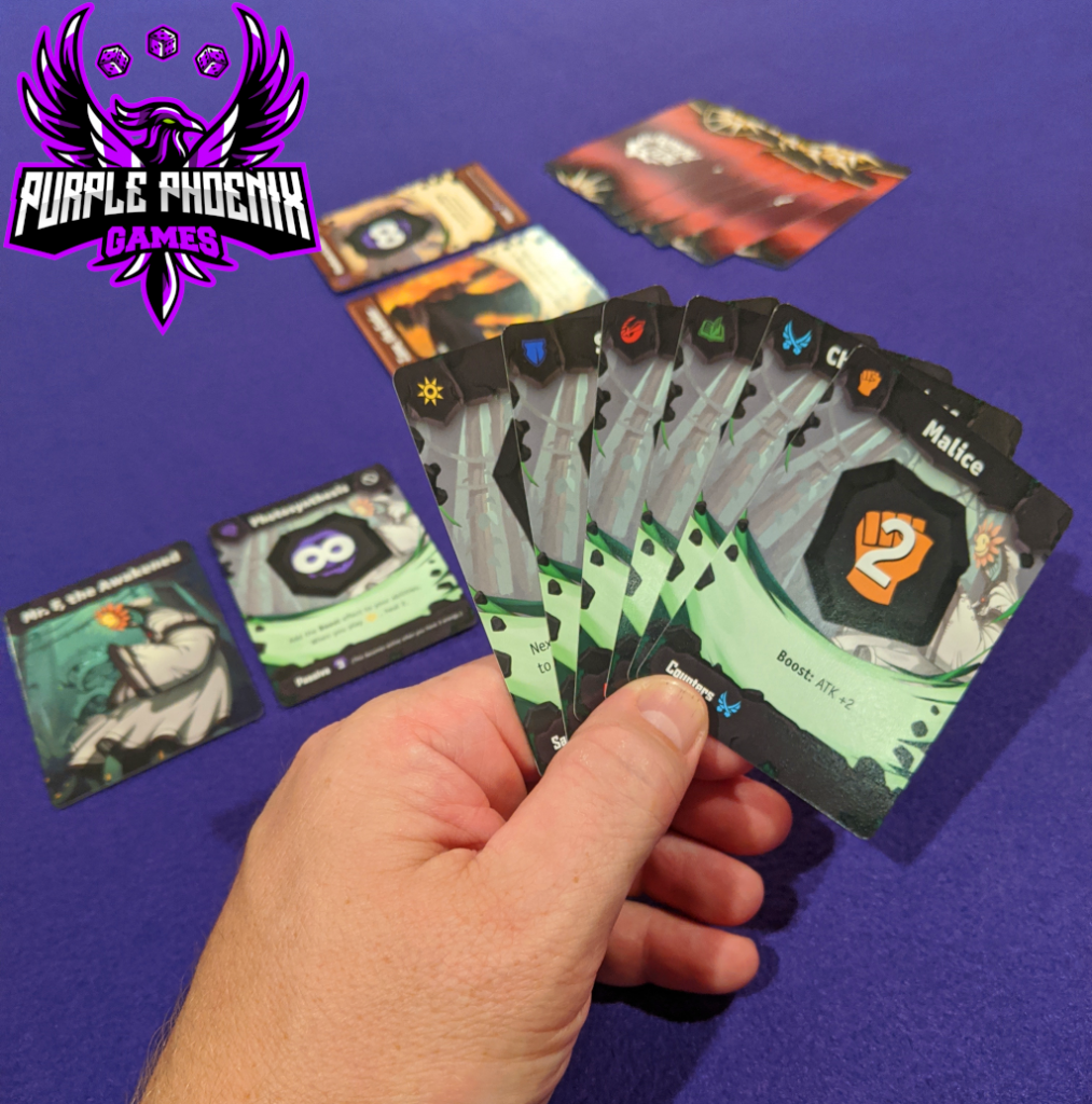 On a turn each player will choose one of the cards in hand to be played, lay it face-down on the table, and flip it once both players are ready. When the cards are flipped, the players will compare and check for Counters. Each card may counter other card types and will have text stating so (Example: the Malice card from above shows that it counters Agility cards). If a player can play a card to counter their opponent’s card then the countering player sends the opponent’s card back to their hand and will gain one Energy. If the card played had damage printed on it, the countered player will reduce their HP by the printed damage amount. However, if no cards were countered, then both cards will activate and assign any damage. The next round may now begin with players choosing cards to be played one by one until a player is knocked out of the game.