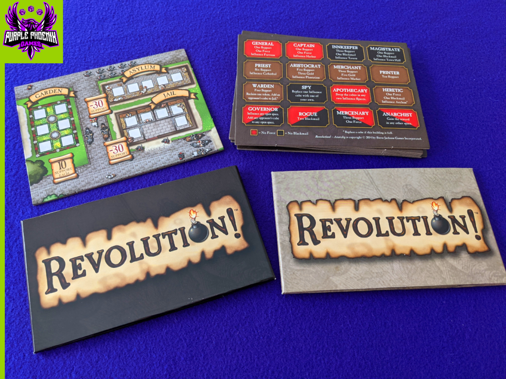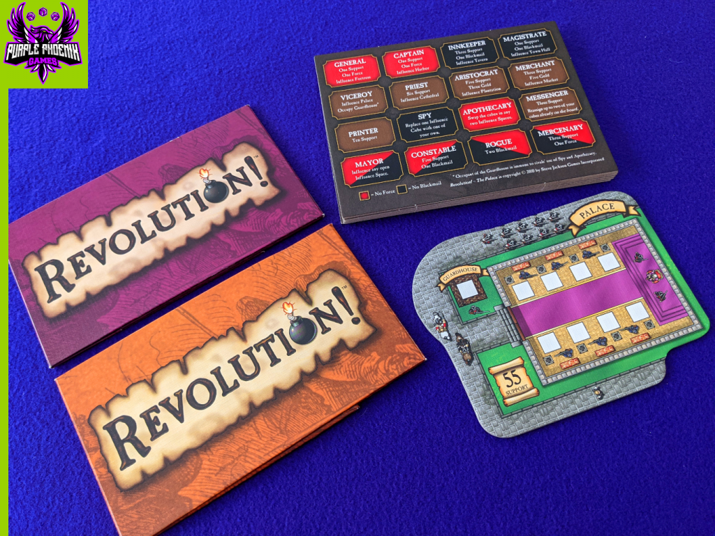 This breakdown is for the excellent game Revolution! and the expansions The Palace and Anarchy, from Steve Jackson Games.