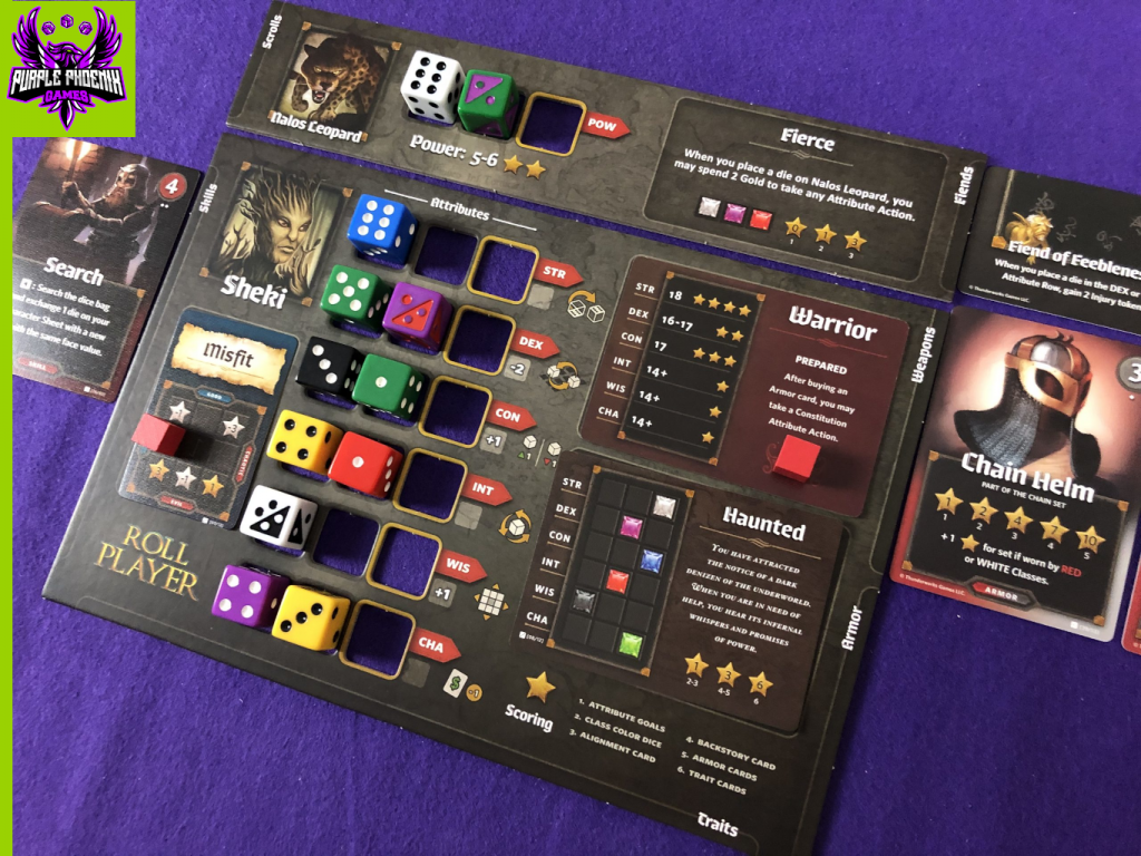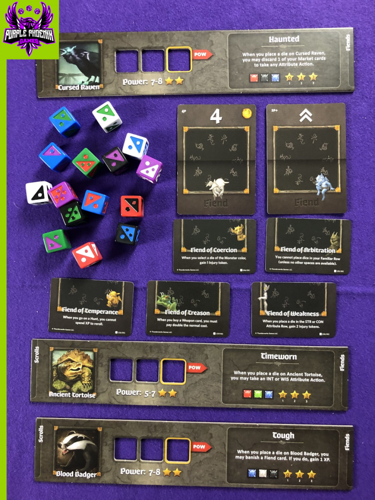 This review is a breakdown of the Fiends & Familiars expansion for the game Roll Player. Pictured below are some of the new components introduced in this expansion. Setup for a game is very similar to the setup for the base game, with a few additions. Split Dice are added to the dice bag and count as both of its colors throughout the game during character creation. A deck of Minion cards is assembled with which characters can fight to earn XP, trophies, and Honor. A ‘final boss’ Monster with corresponding Adventure cards is selected for the characters to square off against at the end of the game. The basic setup for players’ character sheets and the Market are essentially the same as in the base game, with this addition. Each player receives 2 Familiar boards, and selects one with which to play the game. Shuffle the deck of Fiend cards and draw/place a card on each Initiative Card with a Fiend slot. A starting player is selected, and the game is ready to begin!