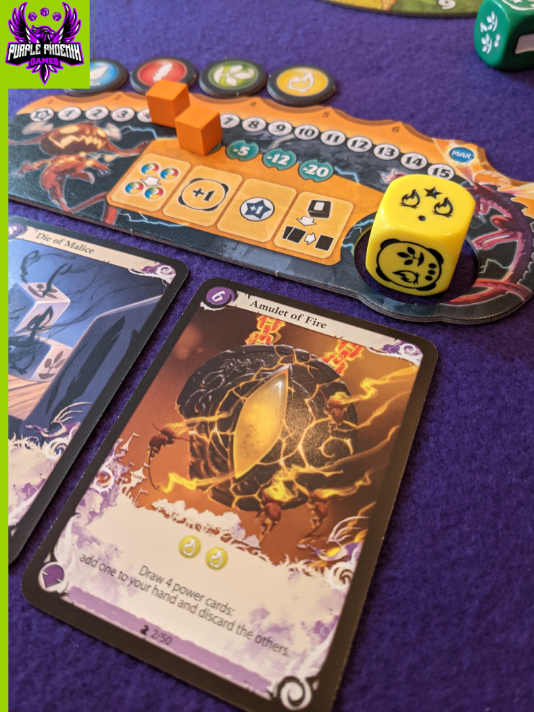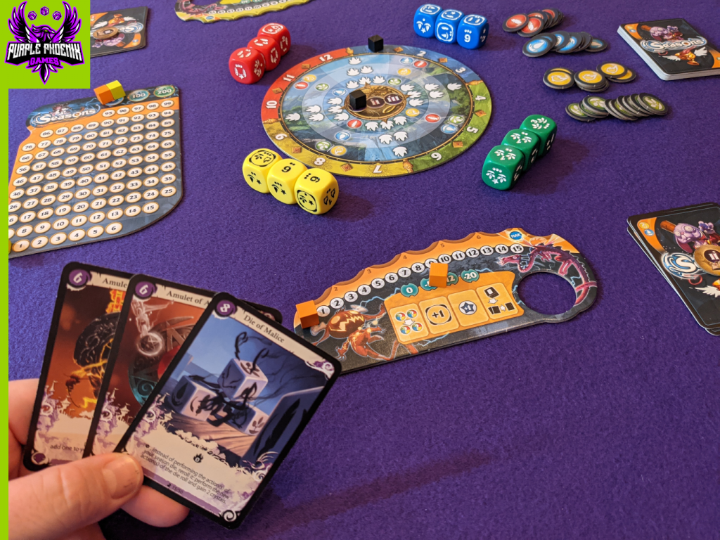 Play continues in this fashion of choosing and resolving dice, playing cards, and transmuting tokens for crystals until the cube has completed its three year journey around the main board. At that time crystals are scored from cards and added to the tracker, with five points deducted for each card remaining in hand and points deducted for the usage of bonus actions. The player with the most crystals at the end of the game is the winner!