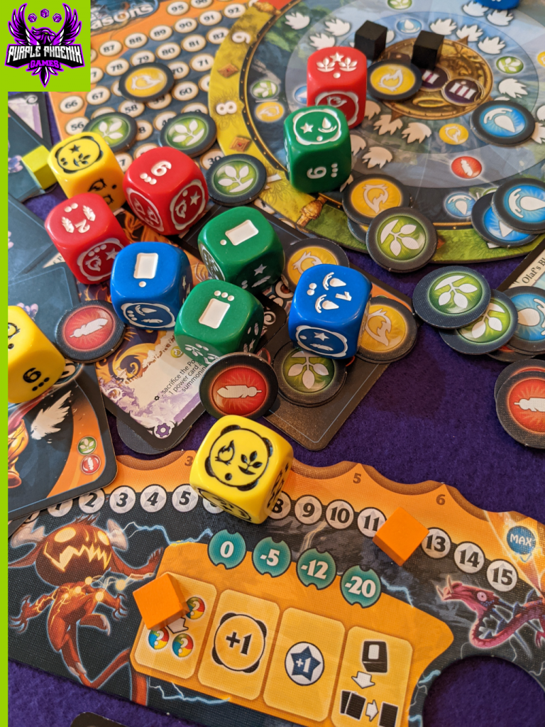 Components. I have a lot to say here, but will attempt to be as succinct as I can. The components in Seasons are simply phenomenal. Yes, the boards, cards, and cubes are all fine quality and unimpressive. However, the art style throughout the game and those big chunky dice are the real standouts to me. I mean, who DOESN’T like to roll big, chunky dice? And the player colors? Oh man, I love them! Players can choose orange, purple, gray, or lime green. Those are some great color options, and such a simple upgrade from primary colors used on many other games. The dice are primary colors, but I still enjoy them and I will let it slide. No real complaints on components from me. I have heard complaints about people not vibing on the color choices associate with the elements/energy, but I applaud the mold-breaking here. Why can’t Fall be red and associated with a feather? Why can’t Summer be yellow and associated with a flame? Fire doesn’t always have to be red. Go on, Seasons! Be you!