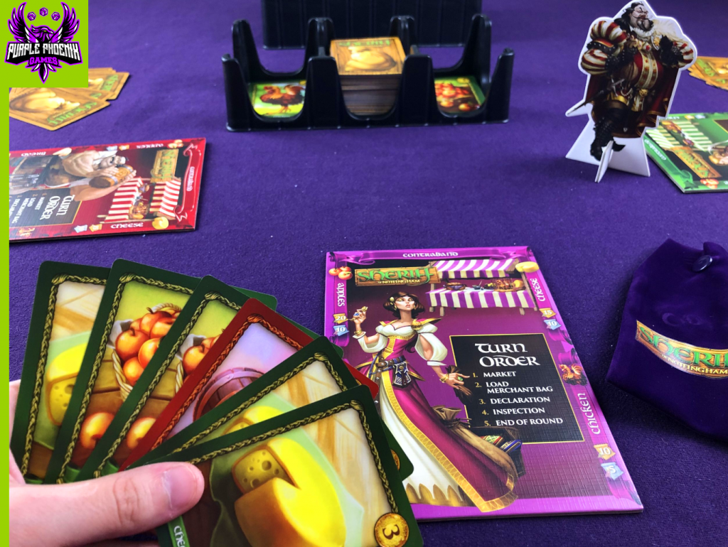 The next phase, Load Merchant Bag, is pretty self-explanatory. All merchant players will select up to 5 cards from their hand to place in their merchant bag. Snap it closed, and place it in front of you for the next phase, Declaration. In this phase, players will take turns declaring what good they are bringing to market. You must say exactly how many cards you are bringing, and you may only declare 1 type of Legal good! Even if your bag has multiple types of goods, you must declare only 1 type. Here is where your bluffing skills come into play! Once all players have made their declarations, the game moves to the Inspection phase, and it is now time for the Sheriff to act! In this phase, the Sheriff will get to decide if they wish to inspect any of the merchant bags, and merchants will have the opportunity to negotiate or bribe the Sheriff to not inspect their bag, or to inspect an opponent’s bag instead. If you make a deal with the Sheriff, you must hold up your end of the agreement!