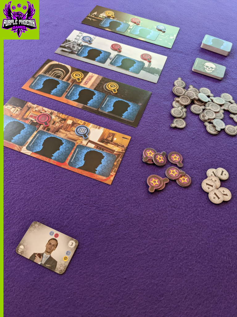 To setup place all four of the Location Boards on the table. These house both cards and tokens throughout the game. These Proof Tokens consist of Witness (yellow), Forensic (red), and Cyber (blue). Gather these tokens into a face-down pile. The starred Universal Proof Tokens and Bonus Point Tokens are gathered in a separate pile. Shuffle both decks of cards separated by back designs and place them nearby. Populate the Location Boards with both Thread Cards (blue back) and random Proof Tokens from the pile. Players are dealt two of the Lead Cards (black back) from which they will choose one to place in front of themselves and one to discard. The game may now begin!