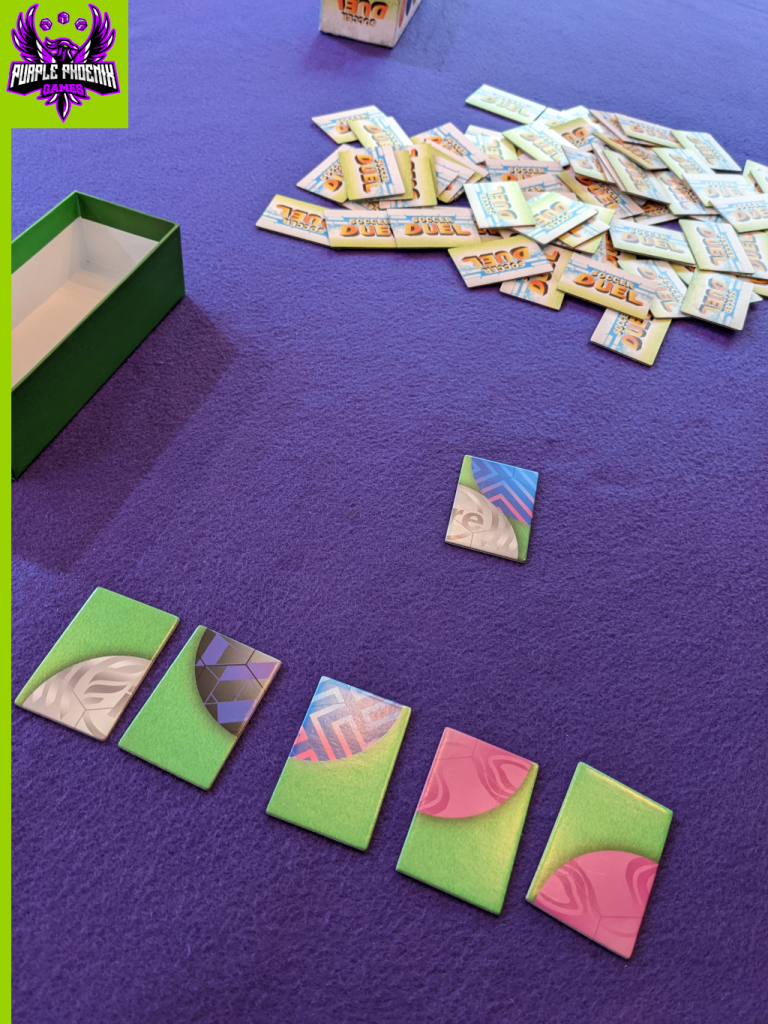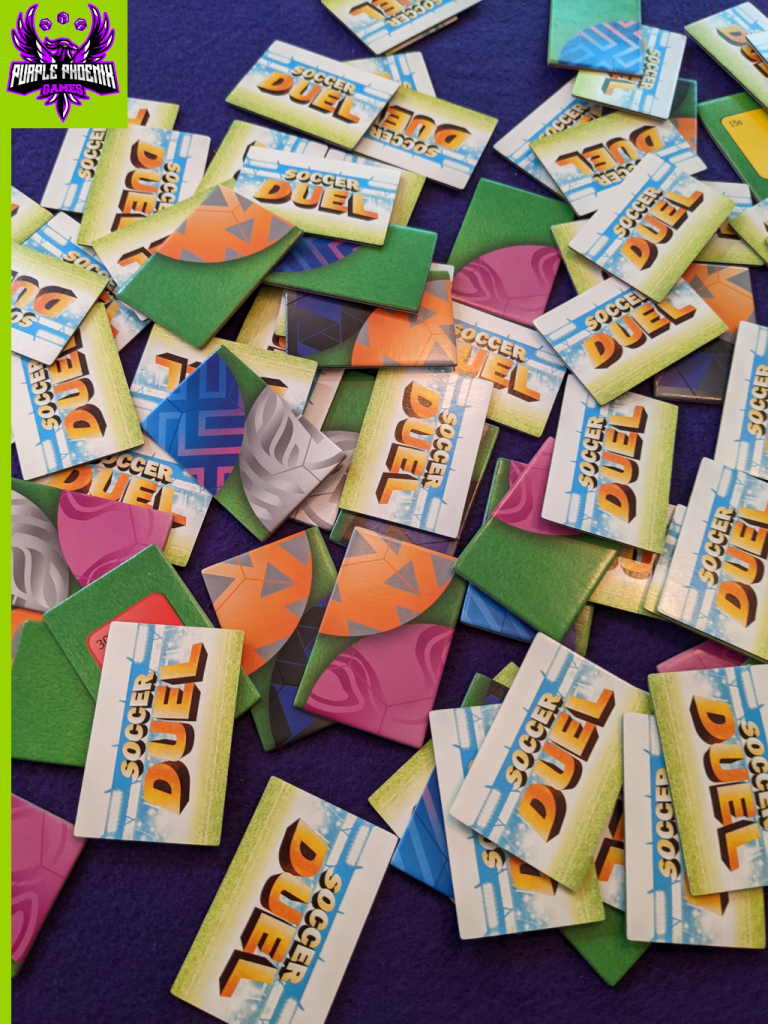 The tagline for Soccer Duel reads, “A face-off battle of speed, wit & dexterity!” While I agree that is a speedy game that takes a decent amount of dexterity, I am leery of agreeing with the amount of “wit” needed to win. In my eyes, players are frantically drawing and hoping for specific tiles in order to complete their balls, especially near the end of the game. I supposed I can see “wit” being appropriate when referencing the decision-making process of which tiles to play/keep and which to discard. A fair bit of luck is also expected and very apparent.