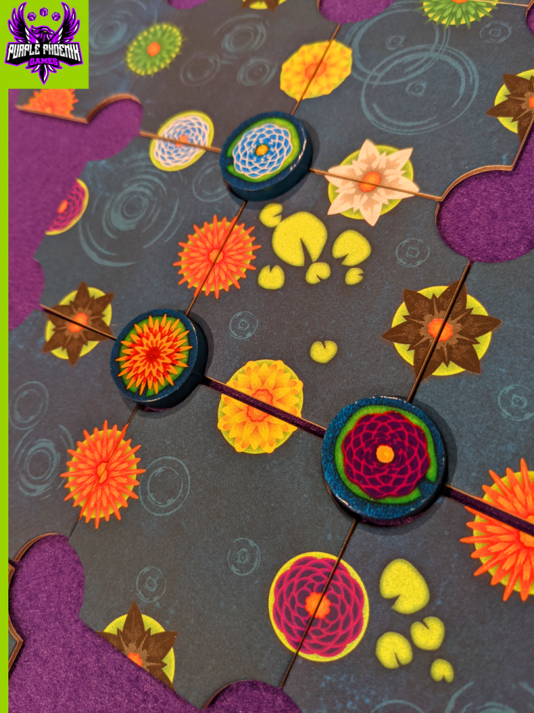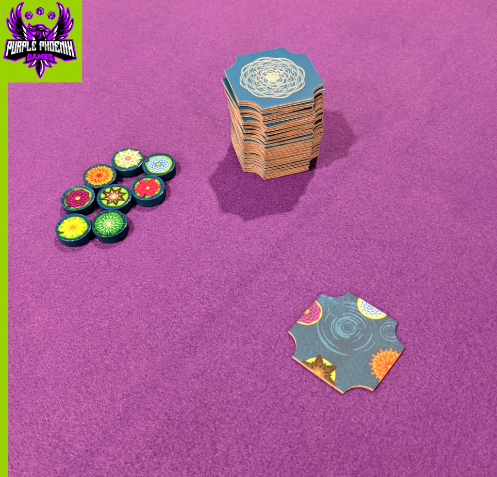 Components. This game is comprised of eight blossom tokens and a bunch of lake tiles in a small box. The lake tiles are all different and feature different lily semi-circles on the edges. They are thick enough to withstand multiple multiple plays and feature incredibly serene artwork. Similarly, the blossom tokens contain beautiful lily depictions upon painted wooden discs. The components in this game are high quality, and suited for addicted gamers’ need for play after play.